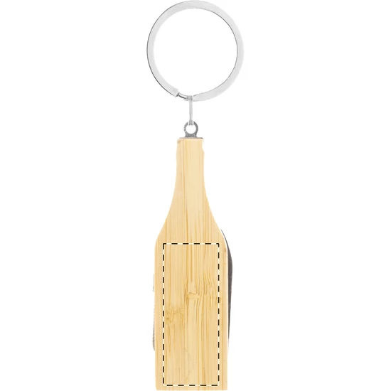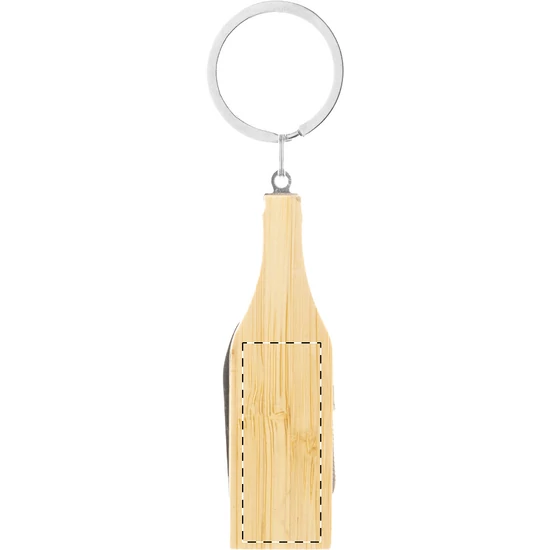 Üveg alakú, multifunkciós kulcstartó rozsdamentes acélból és bambuszból. 4 funkcióval: kés, dugóhúzó, üvegnyitó és reszelő.